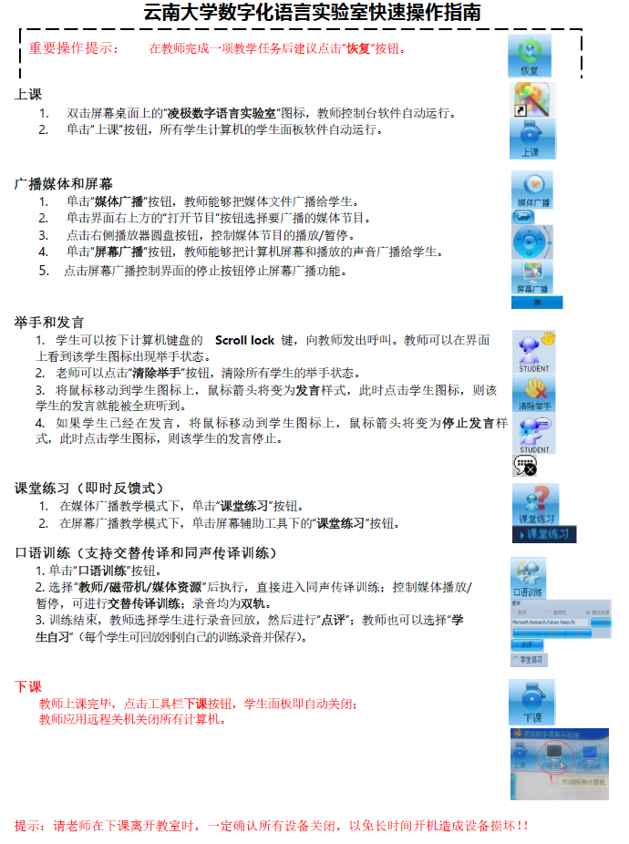 云南大学的全数字化的语言实验室主要用于外语口语教学,请任课教师严格按照操作流程上课确保教学正常进行。
