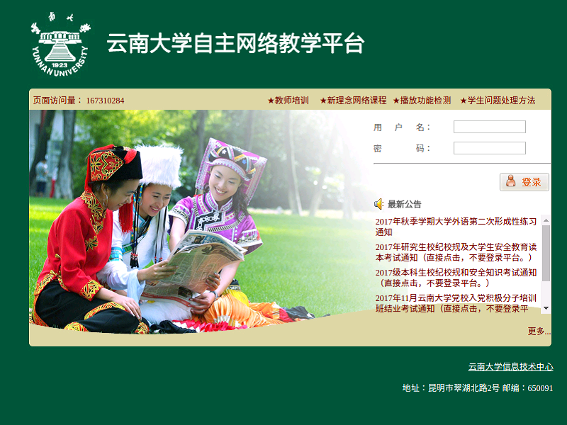 云南大学自主开发的网络教学平台,也称网笃教学平台,主要用于大学英语、研究生公共英语、思政课、学工等公共课程的网络教学、行测和考试。