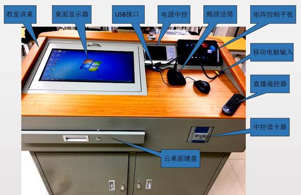 智慧教室的讲桌与普通多媒体教室类似,但由于在智慧教室中教师的讲授时间减少,教师更多是要在教室内不断走动,指导学生的分组学习和研讨,因此讲桌的主要作用是供教师控制教室内的设备开关和切换分组屏幕的画面,教师不宜在讲桌前从头讲到尾。