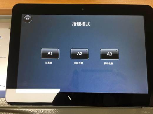 “A1”是与普通多媒体教室相同的云桌面电脑。 “A2”是白板大屏。“A3”是教师自带的笔记本电脑。点击后教室内所有屏幕都显示信号源的画面。