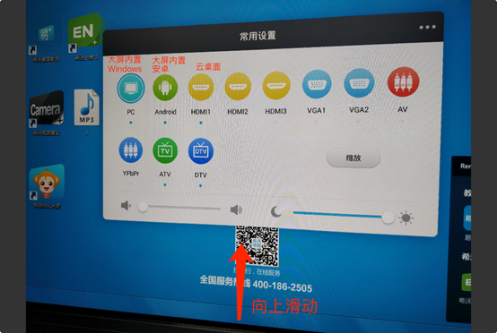 1.从大屏底部向上滑动,点击“PC”切换到大屏内置电脑,教师可以随时在讲桌云桌面电脑和电子白板间切换: