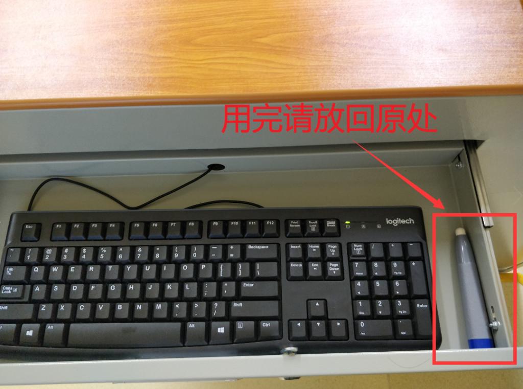 3.使用触屏笔就可以在屏幕上写板书,触屏笔统一放置在讲桌键盘架中,教师下课时请务必放回原处,以便后续上课的教师使用: