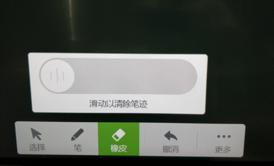 4.点击正下方工具条中的“橡皮”,就可以用触屏笔擦除字迹,如果向右滑动清除笔迹条,将瞬间清空整块白板上的所有字迹: