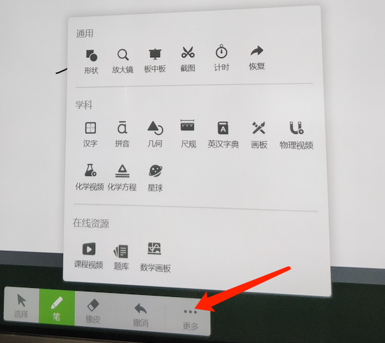 6.点击正下方工具条中的“更多”进入高级菜单,教师可根据自己的课程学科选择相应的功能以便快速绘制各种图形或公式: